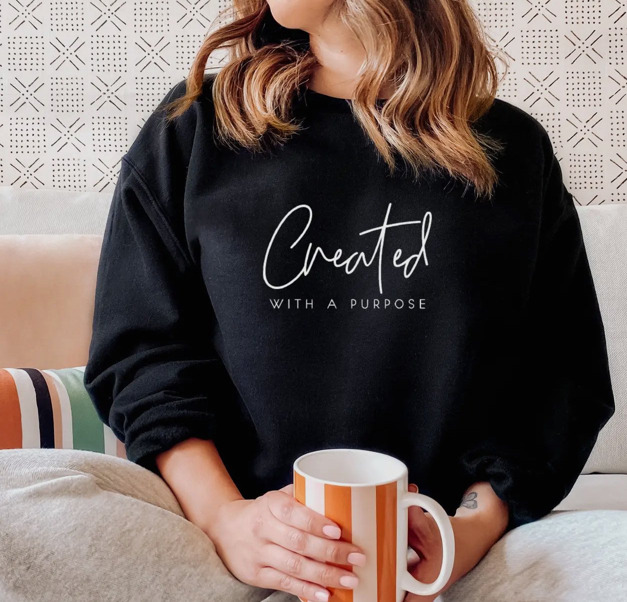 Cozy, classic, and full of meaning. Our custom black Created With a Purpose sweatshirt is a soft reminder that you were made for more.